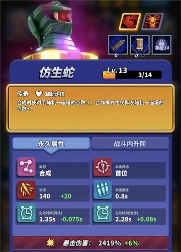 仿生蛇(游戏里的小伙伴们都爱叫它“刀”,这名字很贴切——它能给队友“来一刀”,合成的时候触发效果,让队友的炮塔点数+1,是合作模式里必不可少的角色。)