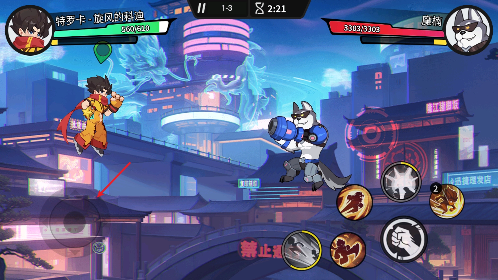 战斗中通过左侧的虚拟摇杆控制人物进行移动。