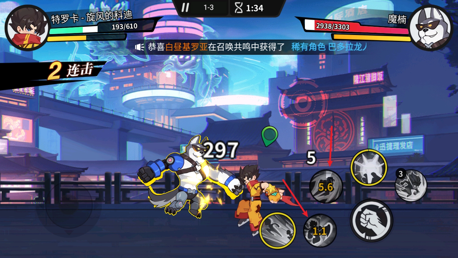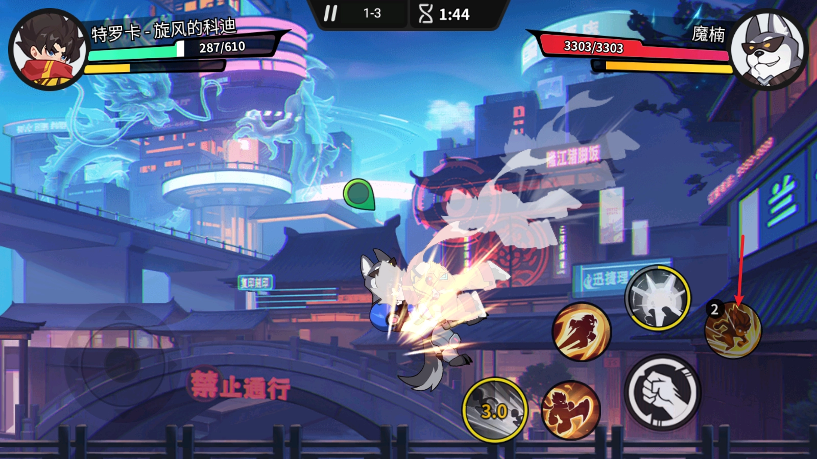 依据角色各自的特性,我们采用不同的战斗方式,点击拳头图标是普通攻击,左边的两个图标为小技能。
