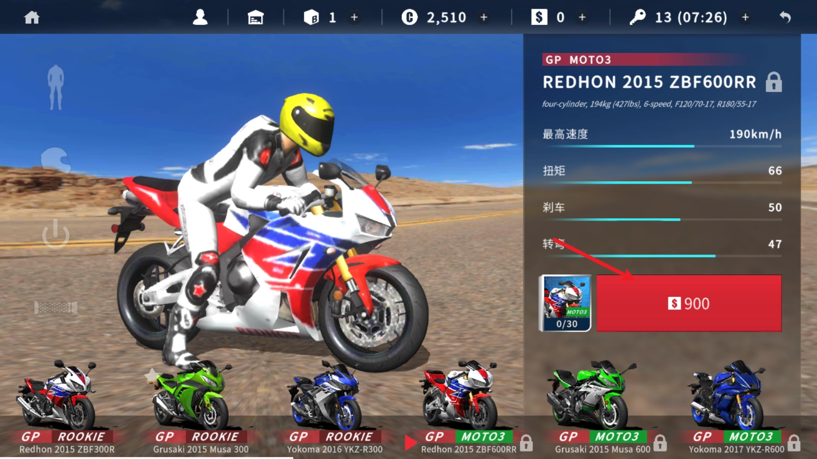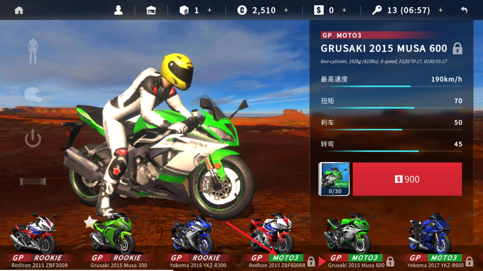 接下来,只要点击任意一辆摩托车,就能进入购买界面,在这个界面里就可以选购心仪的摩托车了。
