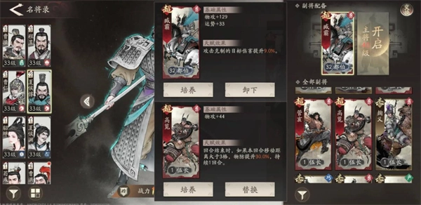 副将选择上,臧霸是首选——他能进一步提升夏侯惇的输出,还能略微增加暴击率,要是雪恨触发后一圈都暴击,那场面绝对亮眼,同时也能增强夏侯惇的克制效果。等40级解锁2号副将栏时,就可以带上高览了。夏侯惇的移动距离基本都会超过3格,而主属性为纯攻击、特技带加防的高览,正好能进一步强化夏侯惇的续航能力。