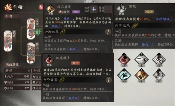 在分支选择上,许褚的两个路线都具备不错的强度。金刚分支主打高暴击,风格类似狂战士;虎贲卫分支则更偏向纯粹的坦克定位,玩家可以结合自身其他主将的阵容来灵活挑选,不同分支对应的技能搭配也有所区别。输出能力较强的金刚分支,适合应对单体BOSS的场景——通过阻挡移动、换位技能搭配强制决斗效果的“裸衣”,单靠许褚一人就能牵制住BOSS,有效防止脆皮队友被BOSS秒杀。而坦度出色的虎贲卫分支,则更适用于敌人小兵数量较多的关卡;该分支除了法术抗性和运势属性略低于金刚分支外,其余面板属性均更占优势,不仅能快速切入战场并施展群体控制,还能顺带叠满自身的被动效果。