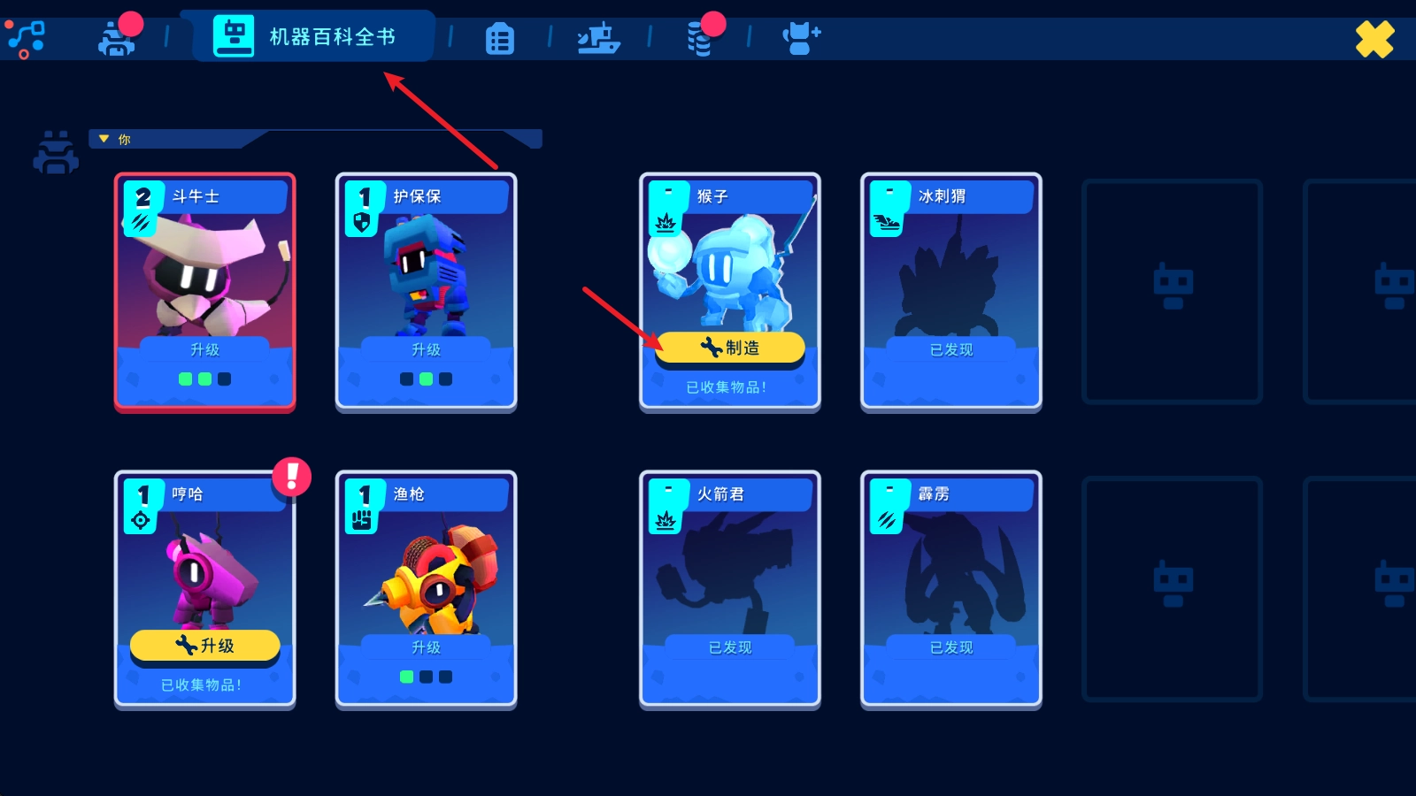 进入后,点击上方的机器百科全书选项,就能在这里进行机器人的制作了。