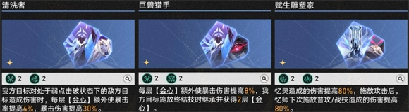 在一星方程里,循环相关的关键是能回复战技点的方程,遇到这类方程建议优先获取——尽管遐蝶队似乎没什么角色需要消耗战技点,但还是先拿到手比较稳妥。至于增伤类方程,可选范围相对有限:其中数值最高的是清洗者,而增益效果最稳定的则是赋生雕塑家。