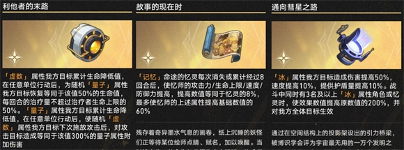 在加权奇物的选择上,推荐利他者的末路、故事的现在时和通往彗星之路这三个。其中利他者的末路尤为关键,只要队伍里配置一名(建议仅一名)虚数角色——优先选万敌,罗刹也可以——它就能把死龙的生命消耗重新转化为输出,效果大概介于小半个到大半纷争剧作家之间,具体取决于该虚数角色能为自身叠加多少增伤效果。