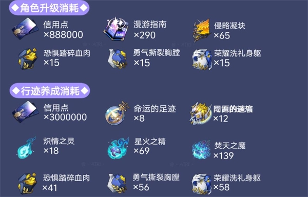 海瑟音的核心输出方式是给敌方叠加多种不同类型的持续伤害效果,其终结技还具备引爆持续伤害、降低敌方防御、回复战技点等多重辅助增益功能,在一定程度上改善了当前持续伤害队伍存在的短板问题。该角色的养成材料消耗情况可参考图示。