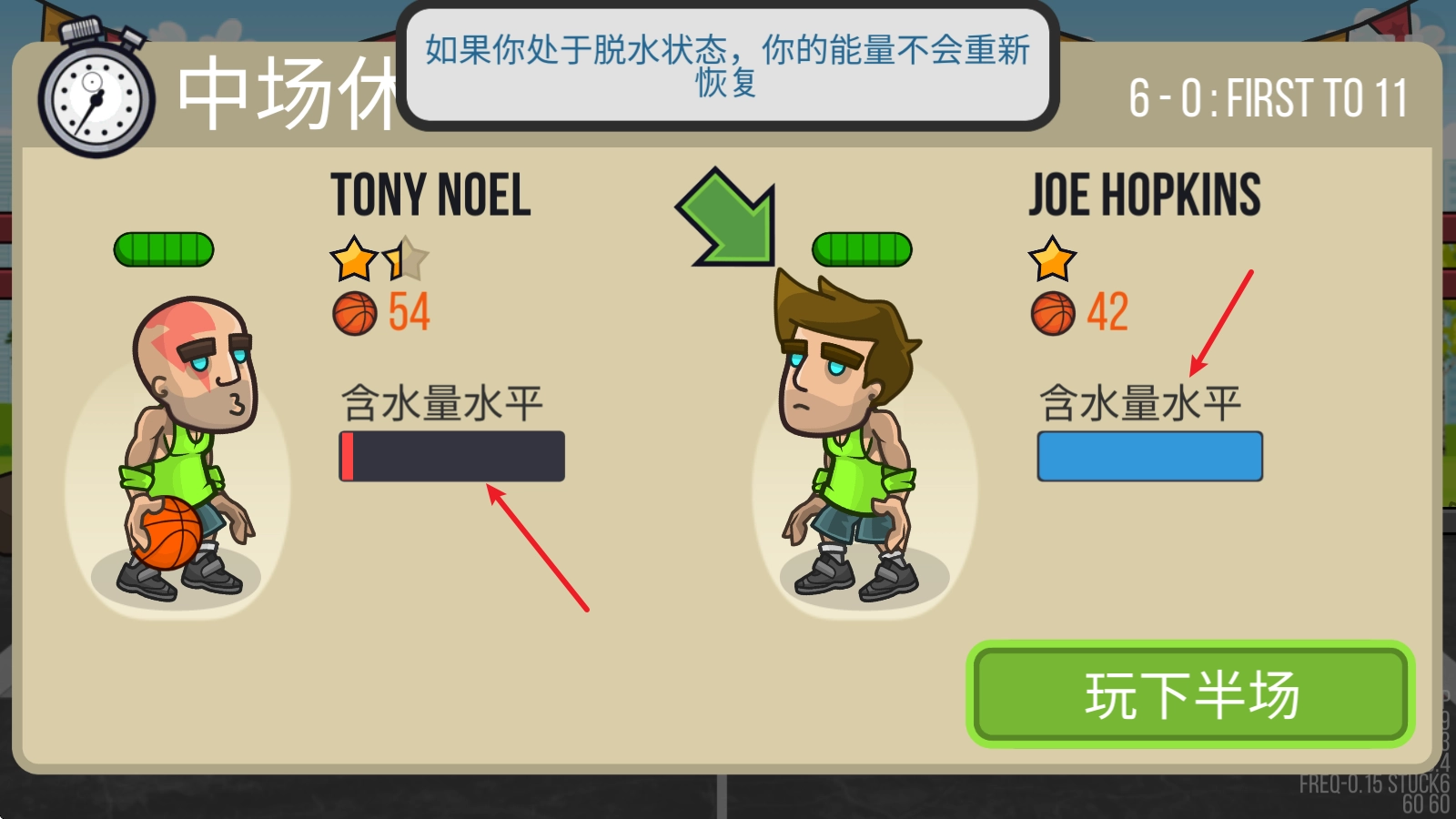 比赛分为上下两个半场,我们要留意己方球员的身体状态,一旦状态不佳就得及时替换选手上场继续比赛。