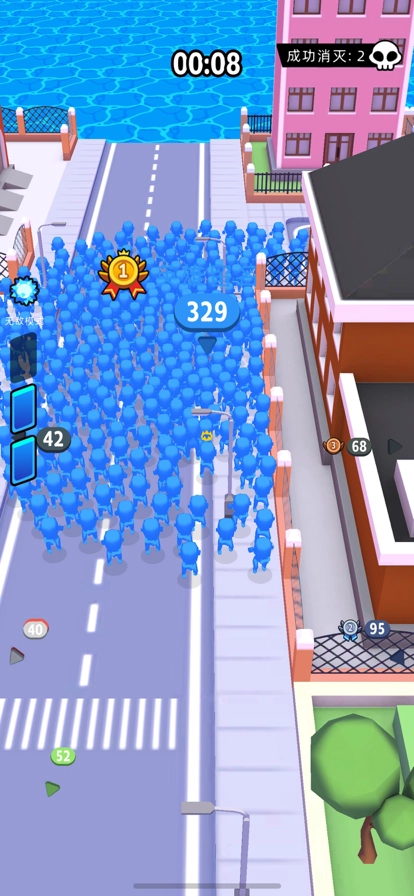 拥挤城市的玩法很有创意,玩家控制一队人马在城市里穿梭,一边收集资源一边招募成员,让队伍不断壮大。玩法规则简单:遇到其他队伍就冲上去,把对方的人吸收过来增强自己。游戏结束时,队伍人数最多的玩家获胜,有点类似街头争霸的氛围。操作不难,但要想玩得出色,就得讲究策略,比如如何利用城市街道,以及在关键时刻吞并对手。