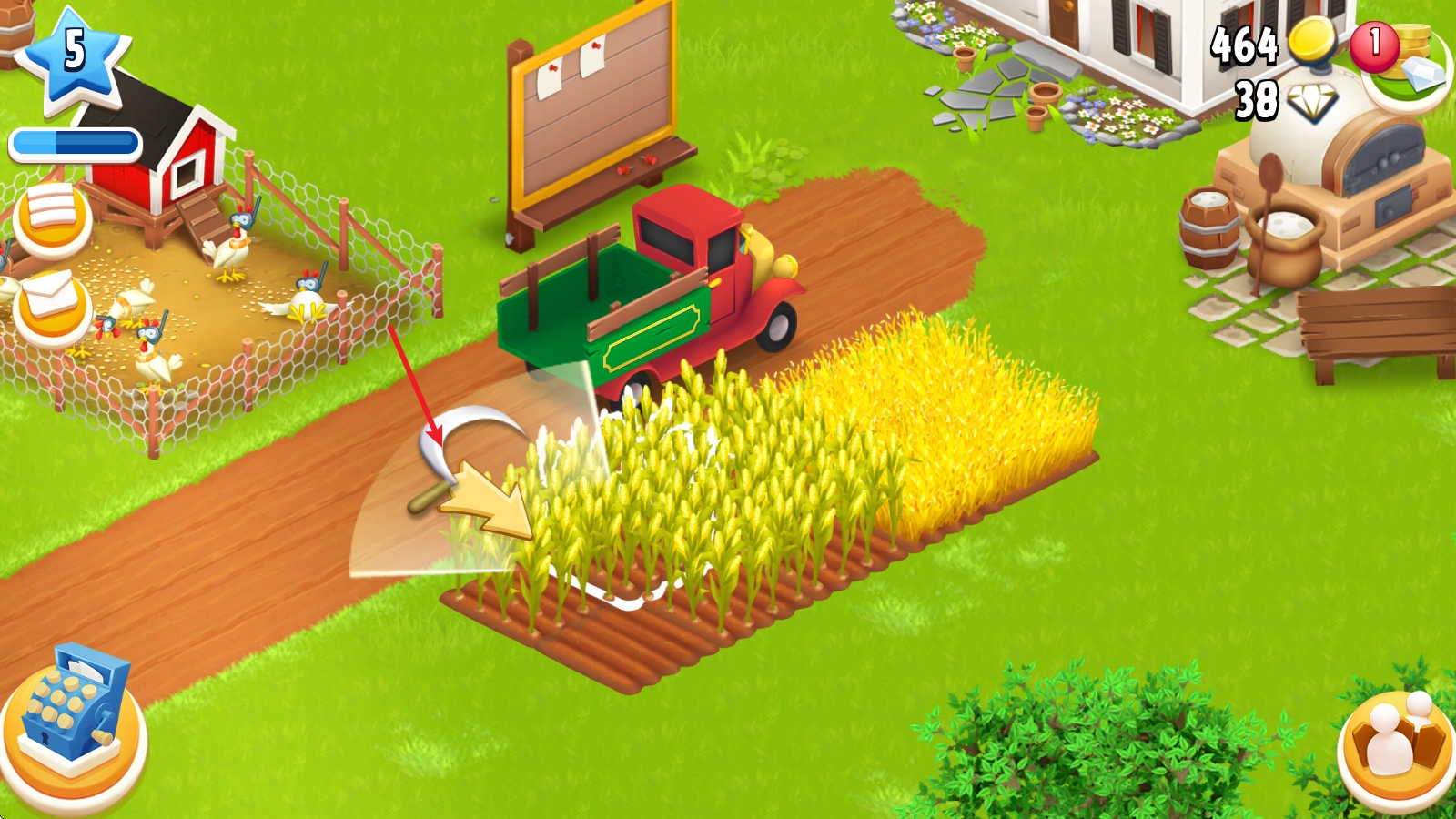 成熟后,点击即可出现镰刀,拖动镰刀即可一键收获。