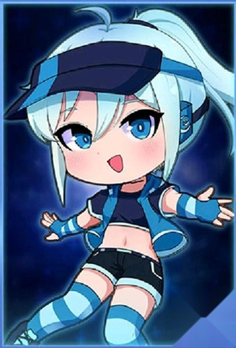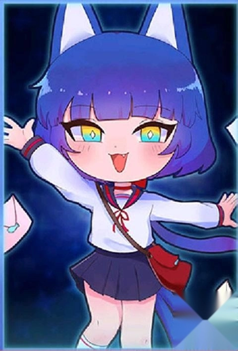 有着蓝色的头发,头顶立着一对猫耳,上身穿着蓝色短袖,下身搭配黄色短裤,双手戴着白色手套——这套在卡牌设定里属于校服;性格方面则十分开朗活泼。