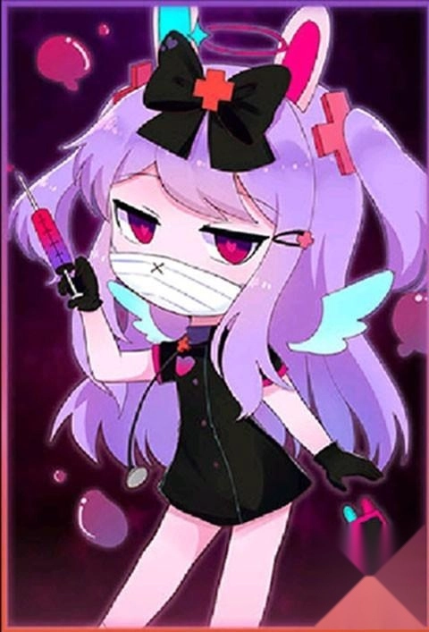 雪白皮肤,紫色头发,穿着黑色护士服,头顶有光环。