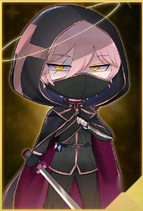 这位男性角色有着褐色的头发,身着红色披风与黑色军装,脸上戴着面罩,手中还握着一把刀。