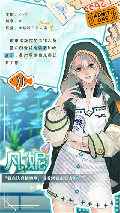 她是水族馆里独一无二的“人类员工”,不过她真正喜欢做的事,是躺在玻璃屋顶上听音乐、消磨时光。尽管她总是一副懒洋洋的样子,却意外地交到了不少朋友。她最爱逗弄那只名叫“六七”的玳瑁龟,一人一龟成了水族馆里一道特别的风景。要是你想找到她,抬头看看屋顶——那个戴着耳机、晒着太阳的身影,十有八九就是她。