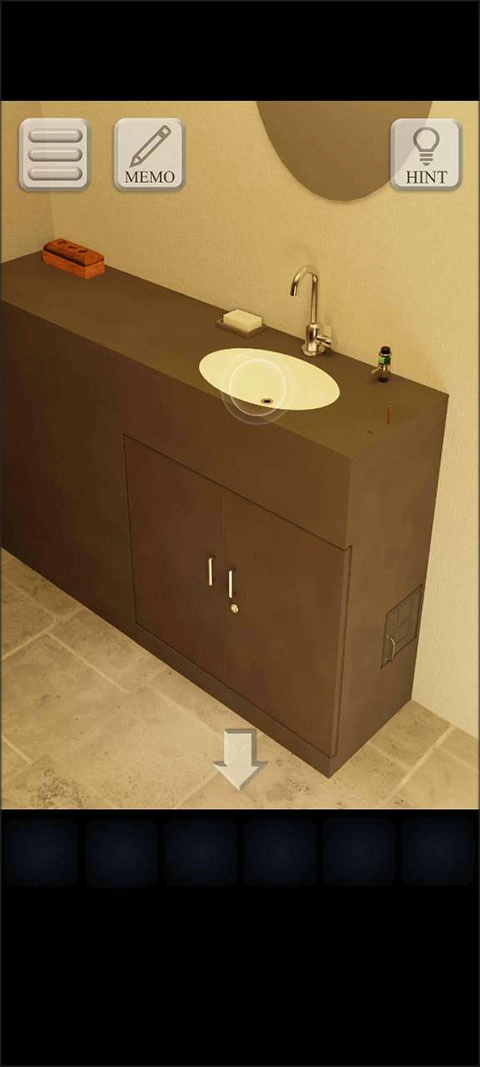 21、走到门口后,把【放大镜】装到洗手池台面右侧的三个孔里,就能得到密码【CFDB】,用这个密码打开地面左侧小柱子,就能拿到【电池】。