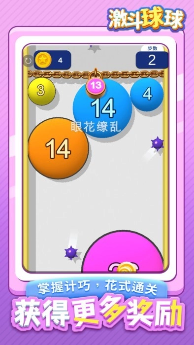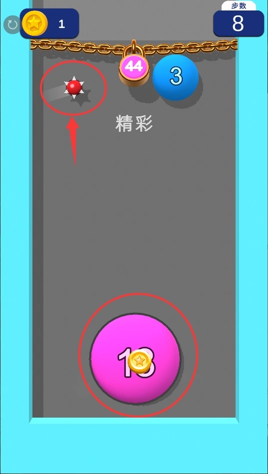 把要发射的球球精准打在目标区域,等累计的数量超过关卡规定的数值,就能顺利砸断锁链取得胜利。