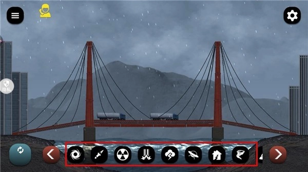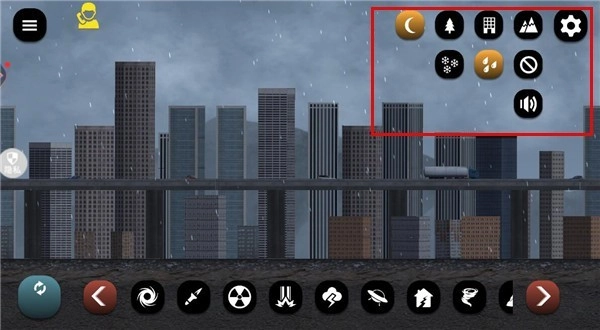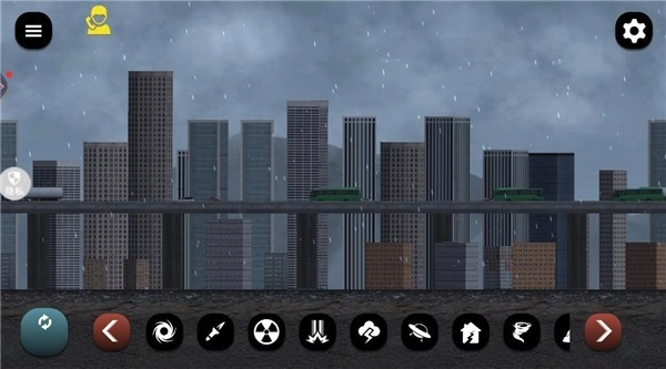5、点击右上角的设置菜单,你能够对城市的背景环境和天气状况进行调整,这些调整会对破坏效果产生影响。