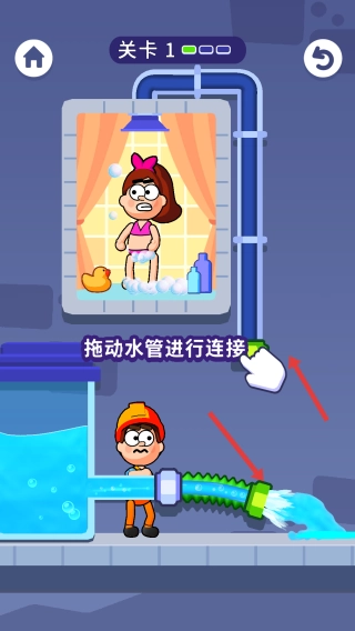 连接水管:在关卡(例如关卡1)中,拖动水管部件,将水源与目标(比如淋浴的女孩)连接起来,使水流能够通过。