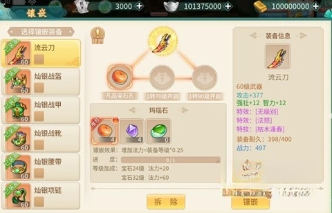 每件装备皆能从两种宝石里挑选其一进行镶嵌,镶嵌等级越高,所增加的属性也就越多。角色首次转生之后,会新增灵品宝石孔,借此可为装备镶嵌更多宝石,促使角色战力大幅提升。