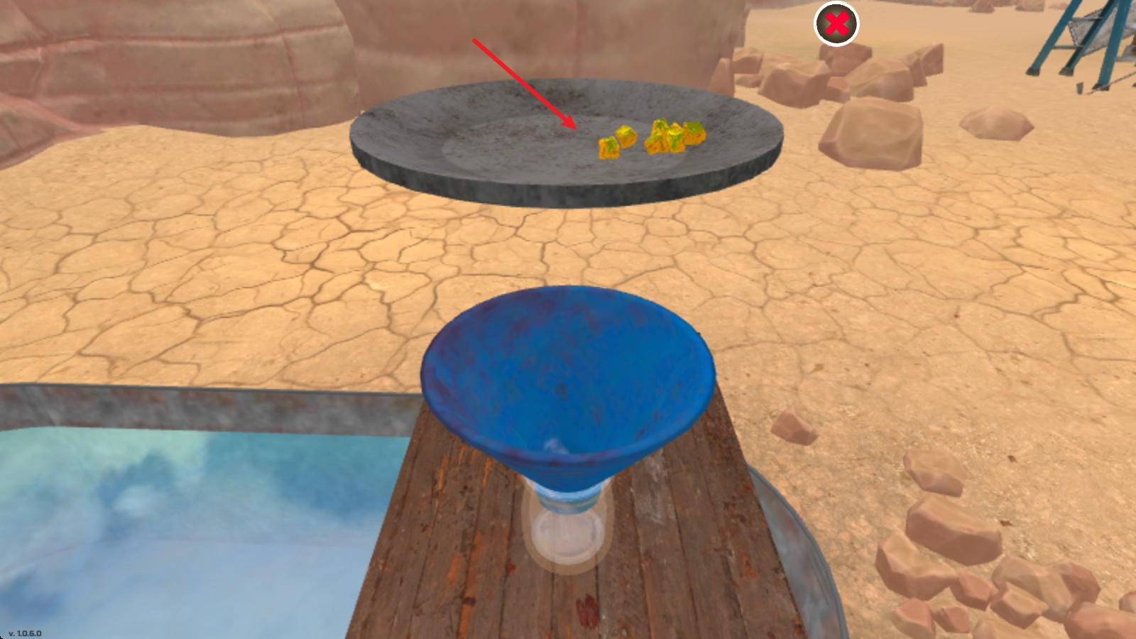 利用水流冲刷矿石进行初步处理,同时通过晃动容器的方式去除杂质,从矿石堆里分离出黄金小颗粒。