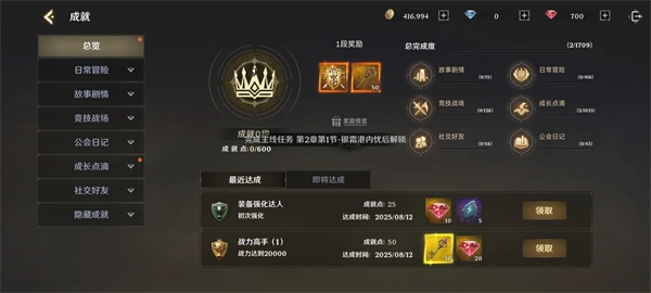 完成成就系统里的各类任务,获取奖励用于提升战力