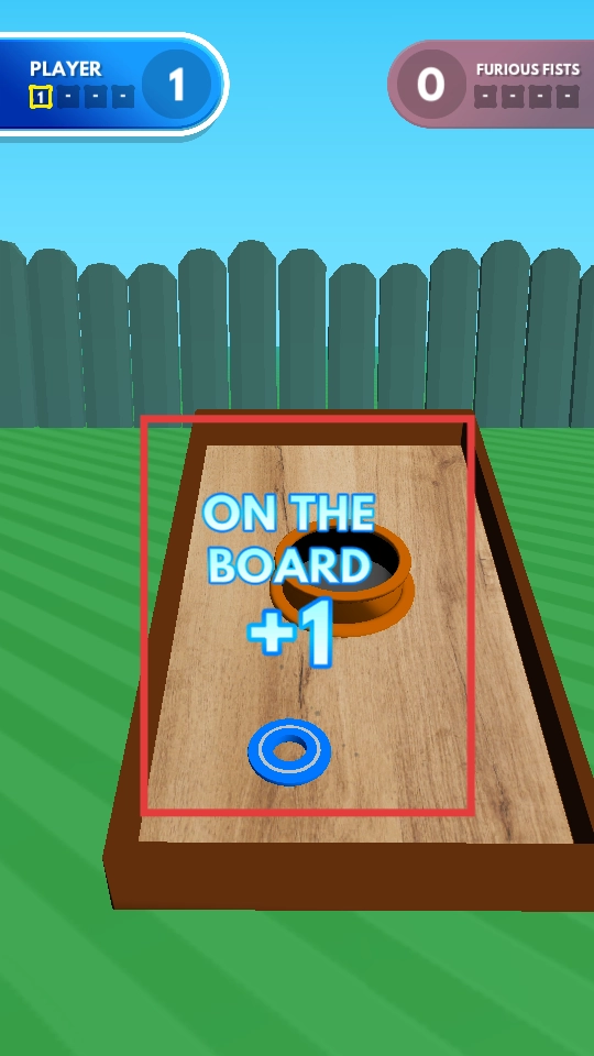 2、对准前方的木制目标板,通过【向上滑动屏幕】的操作,把蓝色垫圈投掷出去,力求让垫圈落在板上,或者投入中间的孔洞里。