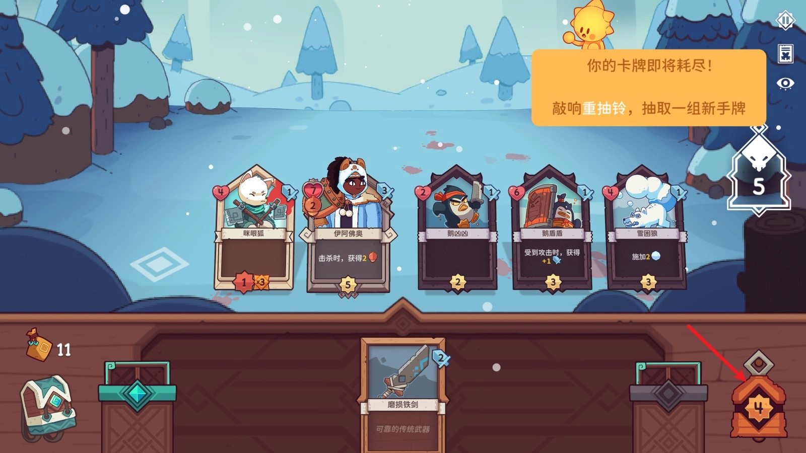要是当前手牌用完了,可以点击界面右下角的铃铛来补充新卡,以便继续制定战术。