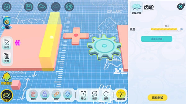 在【机关组件】的详情界面里,能够对该组件的运动以及其他属性参数进行调整,不同类型的机关可调整的参数存在差异(例如齿轮能够调节转速)