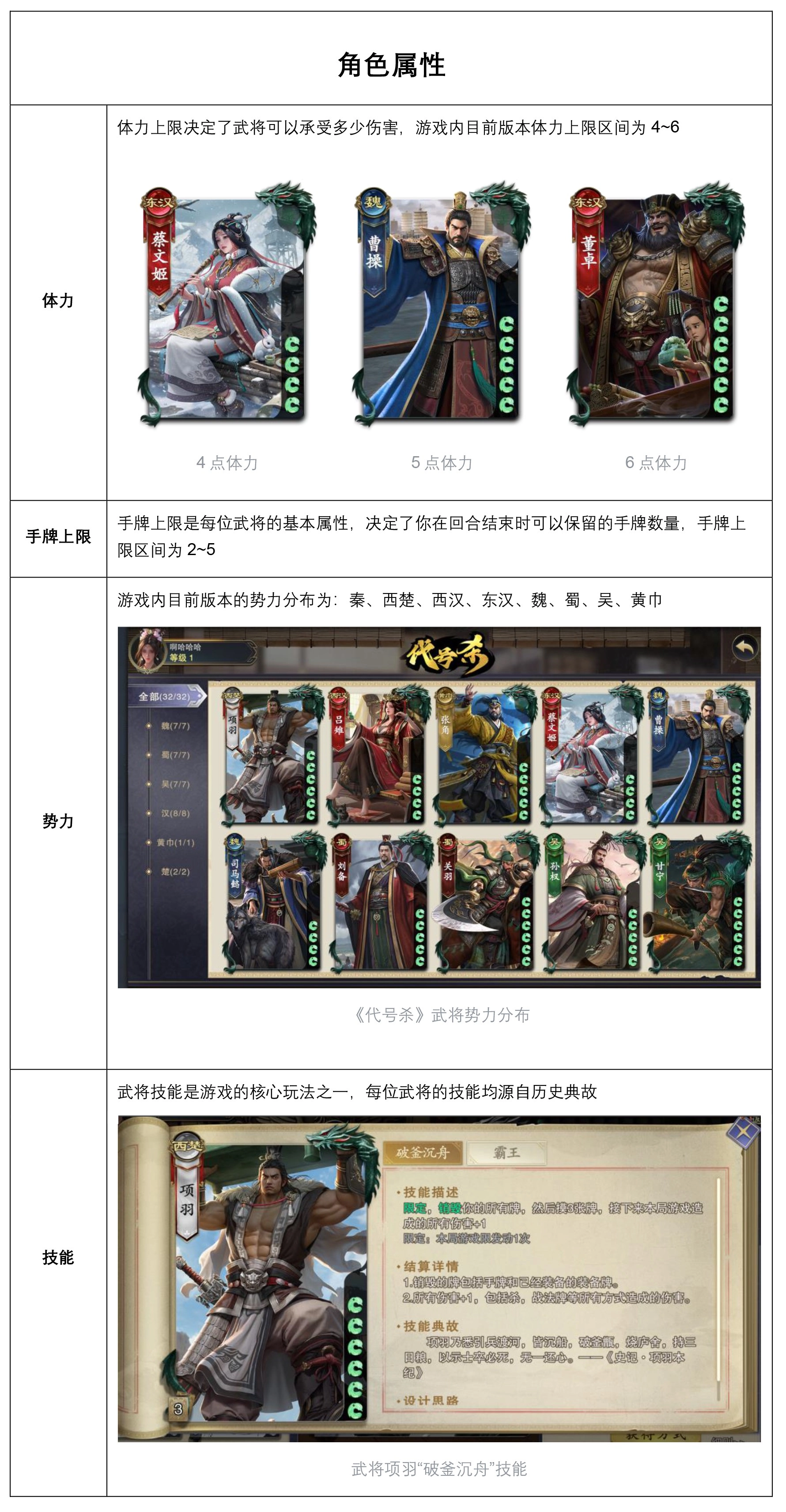 角色体力、势力、手牌上限、技能的技能介绍