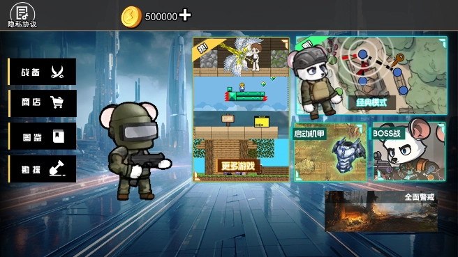进入大厅后,你会看到战备、商店、图鉴、勘探这些选项,此外还有作战经典地图模式可供选择。至于启动机甲和BOSS战模式,建议等你的等级和装备提升到一定程度后再去尝试实战,否则很容易被击败!