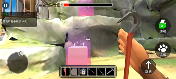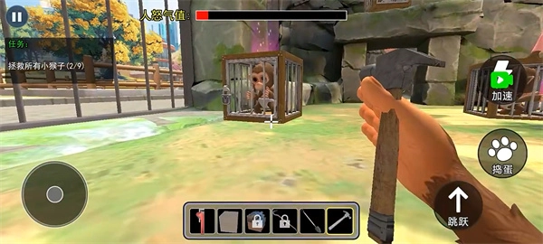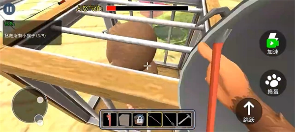 进入游戏后,界面左下角的虚拟按键用于操控角色移动,而右侧的按键分别对应跳跃、捣蛋和加速功能。