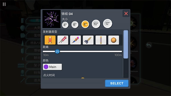 选定烟花后,能够对烟花的尺寸、发射器的种类以及烟花发射的间距等参数进行设置。