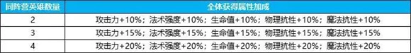 阵营光环:游戏内共有四种阵营:光启、欧律比亚、伊奥、克洛诺斯;当队伍内多名相同阵营的英雄时,将会额外提供加成效果