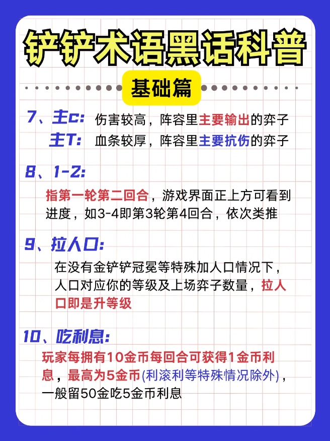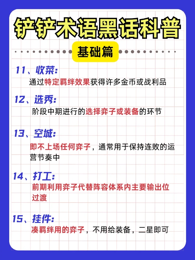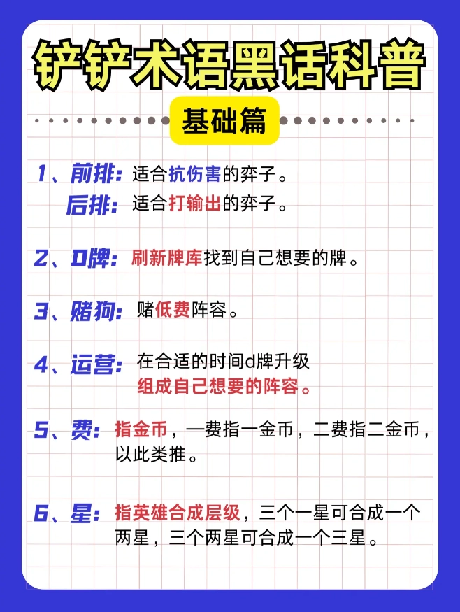 金铲铲黑话小课堂!新手秒懂大佬术语指南来啦!#金铲铲之战 萌新必看入门攻略【前排】承担伤害的棋子【后排】负责输出的棋子【赌狗】专注低费阵容的玩法流派