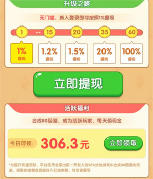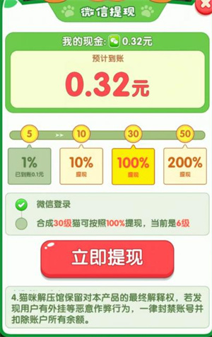 1、玩家登录并完成新手教程后,可直接兑换0.1元红包,该红包会即时到账;第二次提现则需合成5级猫咪,届时可按照1%的比例进行红包提现。