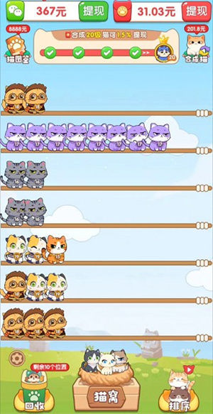 2、游戏第三次兑换红包的要求是玩家需合成10级猫咪,届时可按10%的兑换比例进行红包提现。