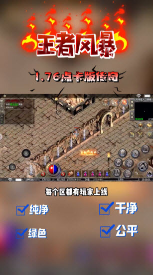 王者风暴1.76点卡版传奇是一款近期新上线的点卡版传奇游戏。这款游戏对经典传奇的内容进行了完美还原,不管是场景设定还是玩法模式,都保留着最纯正的原始风味。游戏不存在任何隐藏的消费陷阱,玩家仅需购买一张点卡,就能尽情体验游戏的全部内容。而且,游戏内所需的各类材料和装备,都可以通过击杀怪物来获取,除了购买点卡之外,不会有其他额外的消费项目。