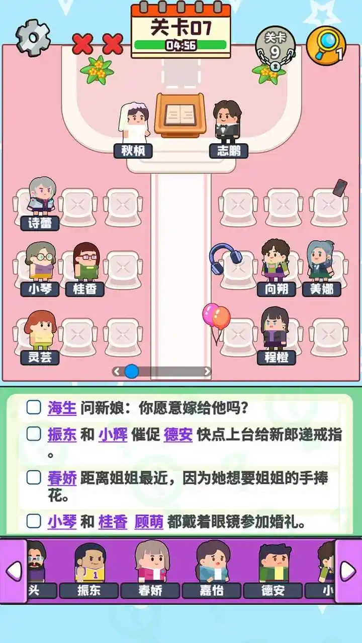 谜题大冒险是一款把生活观察融入解谜趣味的游戏,每个关卡都搭建起一个微缩的日常小剧场——从热闹的婚礼现场到静谧的图书馆角落,游戏会呈现几条满是生活气息的人物线索,邀请你化身洞察入微的布局者。你要做的不过是拖动那些造型萌萌的角色,把他们安置在场景里最恰当的位置。这个过程看起来简单,却需要你细细品味每句提示背后的深意。当所有角色都各就各位,画面会瞬间变得和谐有序,那种茅塞顿开的成就感便油然而生。轻松欢快的节奏搭配恰到好处的脑力挑战,让每一次操作都充满发现的惊喜。