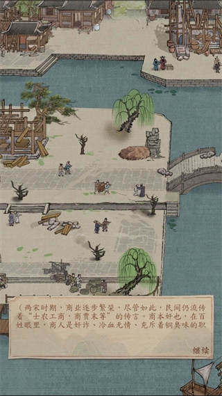 以宋代为时代背景,运用精致的水墨画风,生动再现古代市井的繁华景象。从依水兴起的古城,到青石板路两侧排列整齐的店铺,使玩家仿佛亲身处于那个时代,沉浸式地开启一段传奇的经商之旅。