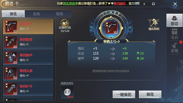 一键强化功能会优先选择强化等级最低的装备进行升级,直到把所有强化材料都用完为止。