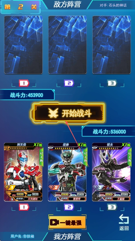 1、打开关卡界面后,先查看敌方阵营的相关信息,明确对阵的对手,接着再查看我方阵营的铠甲勇士卡牌,了解对应的战斗力数值。