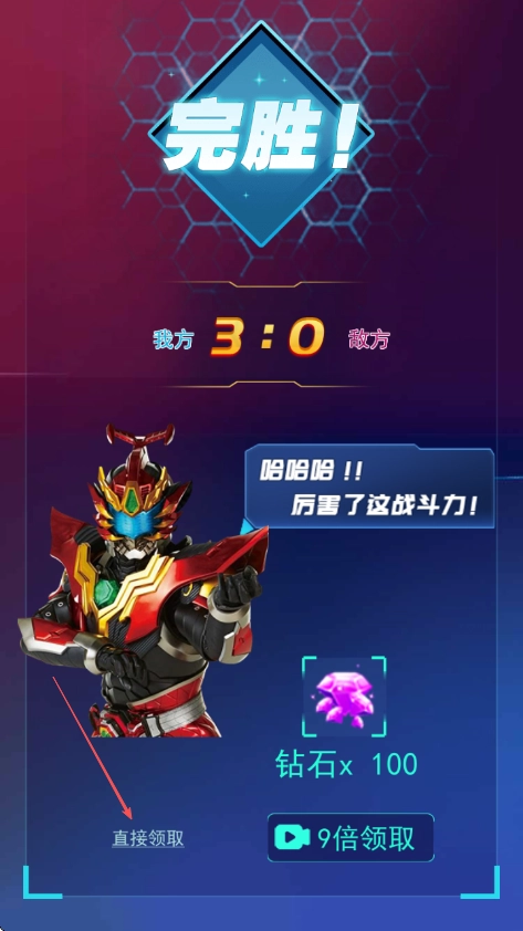 4、战斗结束显示“完胜”后,可通过点击“直接领取”或“9倍领取”按钮,来获取钻石等战斗奖励。
