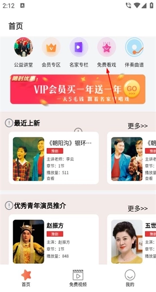 进入首页后,你会看到公益讲堂、会员专区等板块,其中设有免费看戏的入口,同时还能浏览到近期上新的内容以及青年演员推荐。