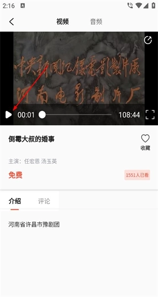 进入剧目播放页面后,会看到视频播放区域,点击播放按钮即可观看视频,同时还能查看该剧目的介绍信息,并且可以进行收藏操作。