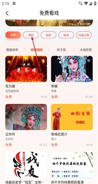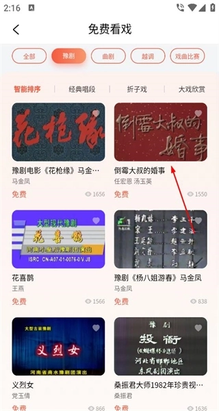 点击“免费看戏”后,会呈现出全部分类选项,从中选择豫剧分类,即可浏览该分类下各剧目的展示卡片,卡片上包含剧目名称等相关信息。