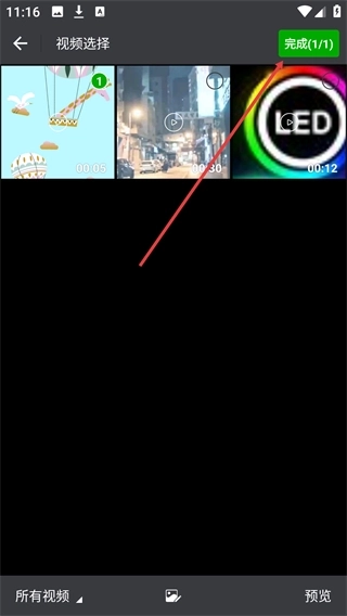 2、进入视频选择界面,选中目标视频后,点击右上角显示为【完成(1/1)】的按钮,即可进入视频格式转换的配置界面。