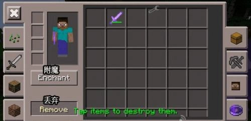 2、进入物品界面,我们能看到背包里的各种物品,还能通过附魔按钮直接附魔物品,可以为各种物品附魔,不光是武器和工具,草方块也能附魔。