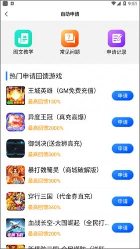 2、其次就会出热门申请回馈游戏,点击第一个王城英雄(GM免费充值)【申请】