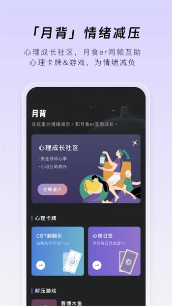 月食是一个专注于心理互助的社区平台。在这里,用户可以享受到一对一的线上心理咨询服务,由专业心理导师实时在线提供指导,帮助大家疏导各类心理困扰,维护积极健康的情绪状态。平台还提供丰富多样的MBTI测试,涵盖性格、职业适配、恋爱倾向等多个维度,助力用户更深入地认识自我性格特质。此外,这里还有一个充满温度的网友互助空间,海量用户在此分享生活点滴,通过发帖交流彼此的人生感悟与经验。