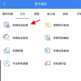 若想查看车辆违法相关信息,可先进入更多服务板块,再点击页面下方的车辆违法处理选项。