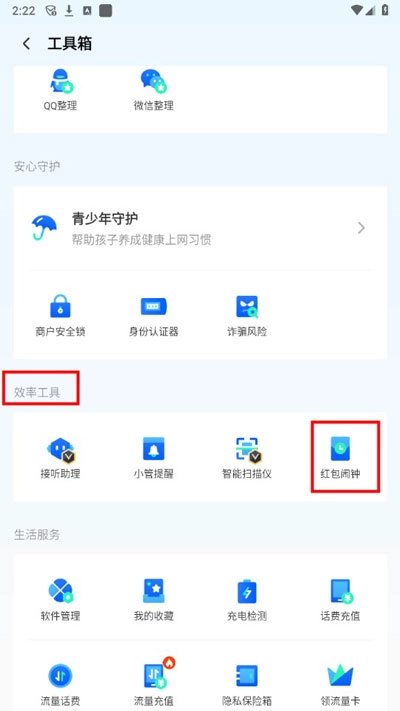 下滑至效率工具栏选择红包闹钟